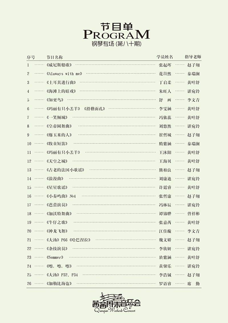 八十期周末音樂(lè )會(huì )—鋼琴專(zhuān)場(chǎng)于2018年4月13日晚在茜茜藝術(shù)體育中心校區舉行!